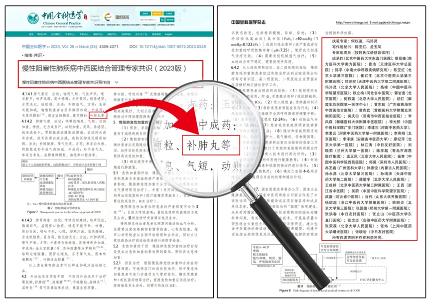 2023 年,北京、上海、广州等全国 40余家知名三甲医院48位慢阻肺中、西医专家在《中国全科医学》上共同发表《慢性阻塞性肺疾病中西医结合管理专家共识(2023 版)》,这是国内首部具权威性的慢阻肺中西医防治结合管理领域共识文献,凝聚结合国内外相关指南及学术研究汇编而成,将补肺丸等中成药列入慢阻肺治疗用药,适用于慢阻肺患者辨证选用。