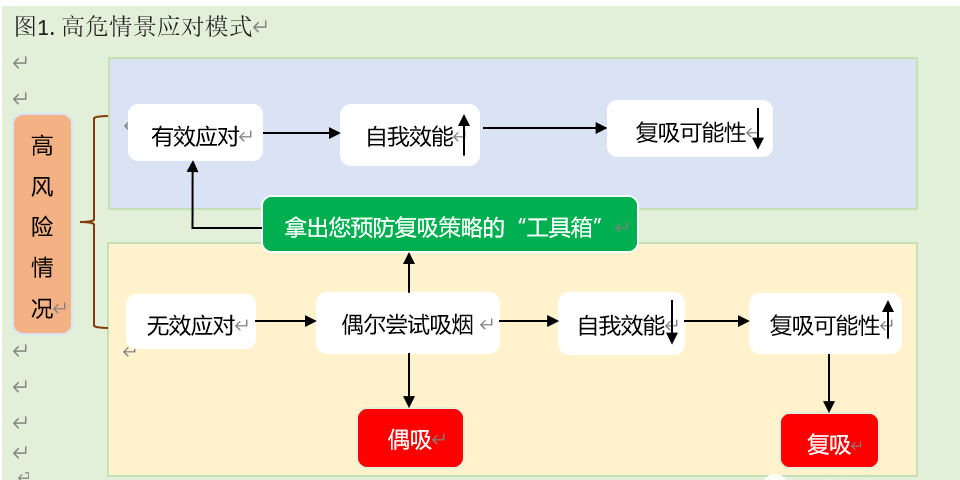 预防复吸的基本步骤介绍:预防复吸的第一步是认识到戒烟期间出现“偶吸”不代表一定会“复吸”,即不代表戒烟失败。您对“偶吸”的认识非常重要,它是预防复吸的关键。您需要采取“偶吸”只是“不小心滑倒一下,站起来继续往前走”的态度。“偶吸”可被视为一个暂时的失误或小错误,不能因此否定您过去所有的戒烟努力,出现“偶吸”行为者仍应视自己为戒烟者。不要将“偶吸”的行为归咎于自身的因素(例如,觉得自己是个意志力不强的人,内心脆弱而难以抵挡诱惑的人),这种情况往往容易导致完全复吸。因为它表示您在某种程度上认为,自己无法控制吸烟行为或没有能力保持戒烟状态。预防复吸训练的目标是将您的注意力转向更多引发“偶吸”的外部的因素(例如高风险环境,或当时的应对策略无效),这样不会觉得是自己“失控”,从而可以很快地恢复到戒烟状态。高危情景应对模式见下图1.