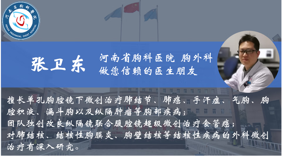 除了肺结节的诊治外,张医生还擅长诊治各种肺癌、手汗症、气胸、胸腔积液、漏斗胸、食管癌、纵隔肿瘤及胸部各种少见罕见疾病的诊治。以及肺部、胸壁、颈部结核等结核疾病的诊治。